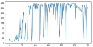 得られる累積報酬がエポックを重ねるごとに増えていっていることが確認できます。200ステップまでしか行動しませんので、この環境での最高累積報酬は200です。